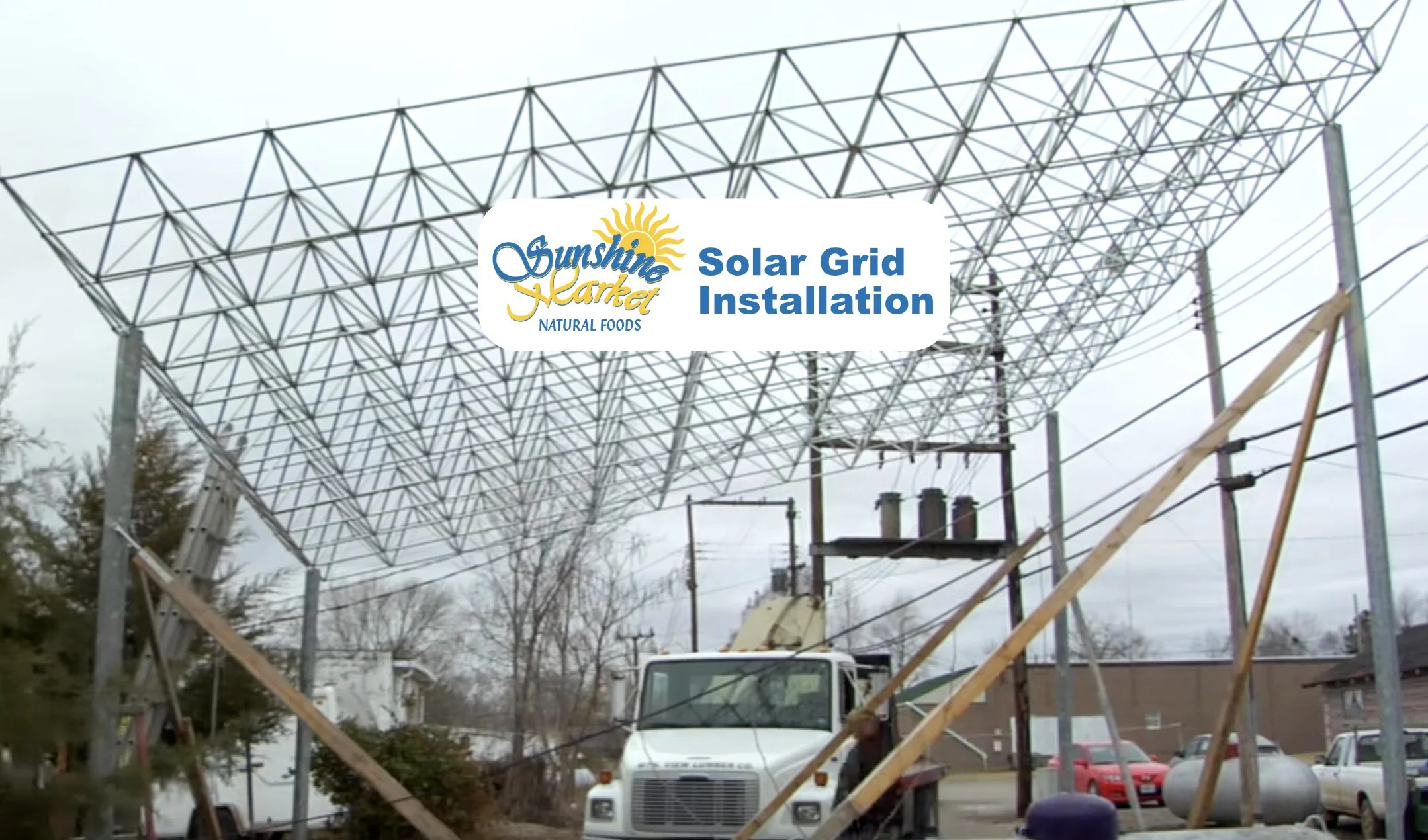 Erecting the grid over the back parking area that supports one of our solar installations. (Time-lapse video by Somewhere in the Woods Productions.)